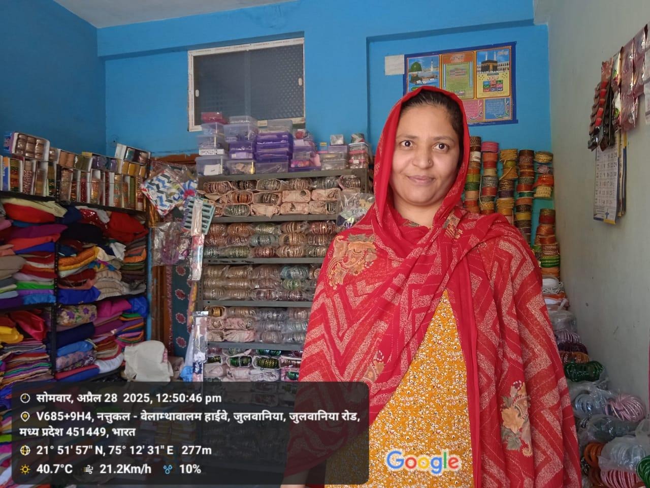 Her business, “Ayesha Collection Cloth Shop,” primarily deals in clothes and bangles. During peak seasons, she also sells readymade kurtas and suits. This diversification contributes to a seasonal income of ₹40,000-₹50,000, with daily earnings of ₹400-₹600, accumulating to a monthly income of roughly ₹12,000-₹15,000. Rukhsana has established her shop in a rented space near the Gayatri Temple in the market. She serves approximately 200 families in Julwaniya and women and girls from surrounding villages.